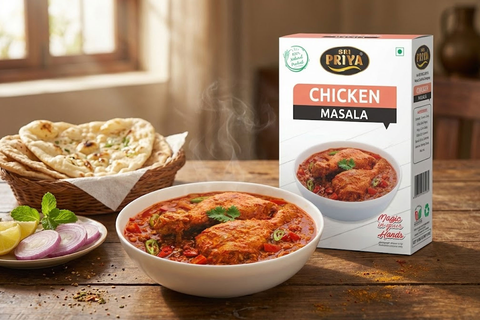 Sri Priya Foods Chicken Masala specially blend kiya gaya hai handpicked, pure aur aromatic spices se, jo chicken ke natural taste ko enhance karta hai.