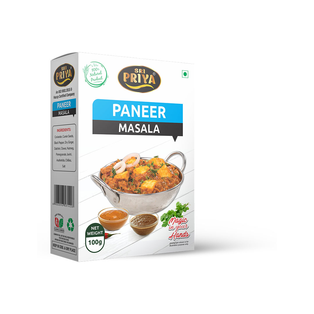 Each ingredient is hygienically processed to retain its natural oils, freshness, and consistent quality. Packed under strict quality standards, Sri Priya Foods Paneer Masala is freshness-sealed to preserve aroma and flavour till the last use.