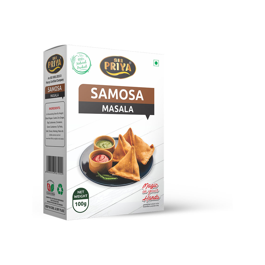 Each ingredient is hygienically processed to retain its natural oils, freshness, and consistent quality. Packed under strict quality standards, Sri Priya Foods Samosa Masala is freshness-sealed to preserve purity, aroma, and flavour till the last use.